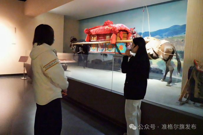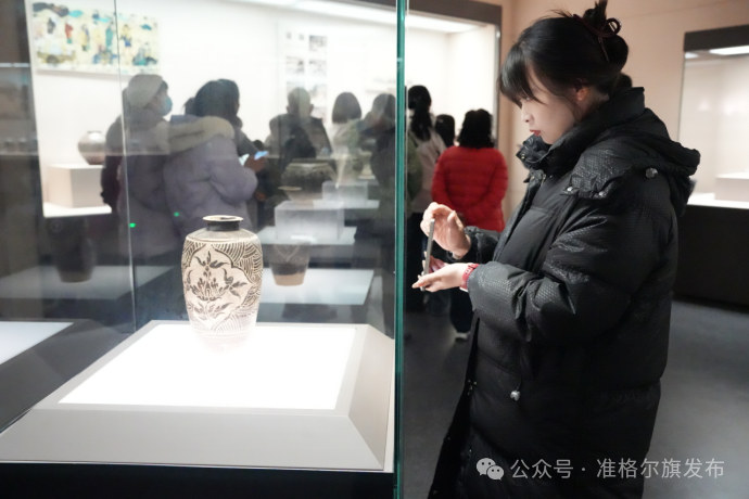 上午10点,考察团来到准格尔旗博物馆。寨子圪旦、大口、永兴店、百草塔等遗址的历史痕迹在这里一一展现。馆内的文物散发着远古的气息,像红玛瑙与绿松石制成的匈奴贵族妇女头饰、“骡驮轿”婚俗、以石为器的“六六八八”菜品等民俗展品,引得代表们不时驻足、拍照。准格尔旗青少年研学旅游有限公司的贾飞表示:“漫瀚调、骡驮轿娶亲等民俗,以及准格尔粗瓷烧作技艺、地毯植物染色技艺等非遗,地方特色鲜明,很适合作为研学游和文化游的重要内容。”