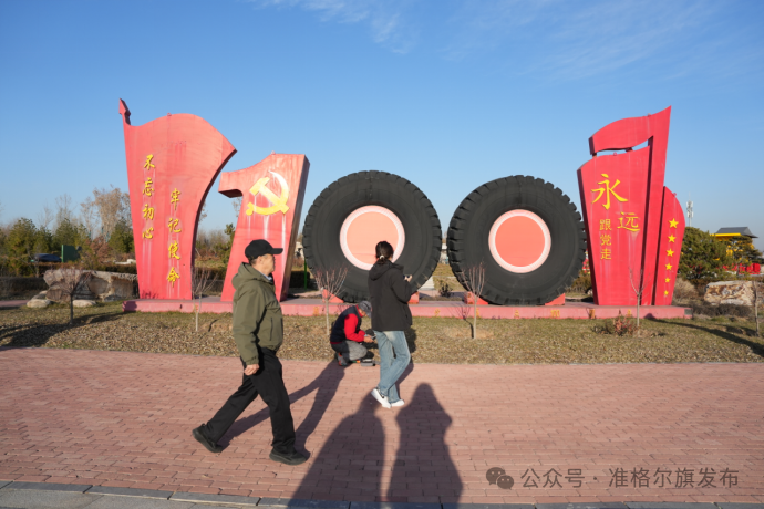 下午,考察团抵达准能矿山生态旅游区。这里曾经是国能准能集团黑岱沟露天煤矿的开采地,如今已变成了充满生机的生态公园。废旧轮胎、设备零件被巧妙改造成景观小品,充分体现了现代工业文明与生态修复的结合。民族复兴柱与56个民族团结柱庄重地立在那里,象征着各族人民共同追梦。代表们沿着步道散步,不时停下记录眼前的美景,对这片土地从“黑”到“绿”的“准能奇迹”赞叹不已。