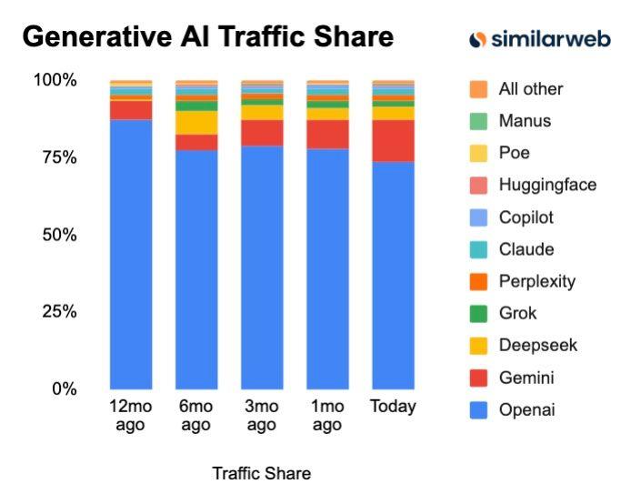 总体而言,这次更新虽有亮点,但OpenAI带来的惊喜越来越少。比起最初的惊艳和爆火的4o生图,GPT-5表现欠佳。根据10月报告,GPT在2025年市场份额持续萎缩。尽管抢占先机保住龙头地位,但AI界竞争依旧残酷。