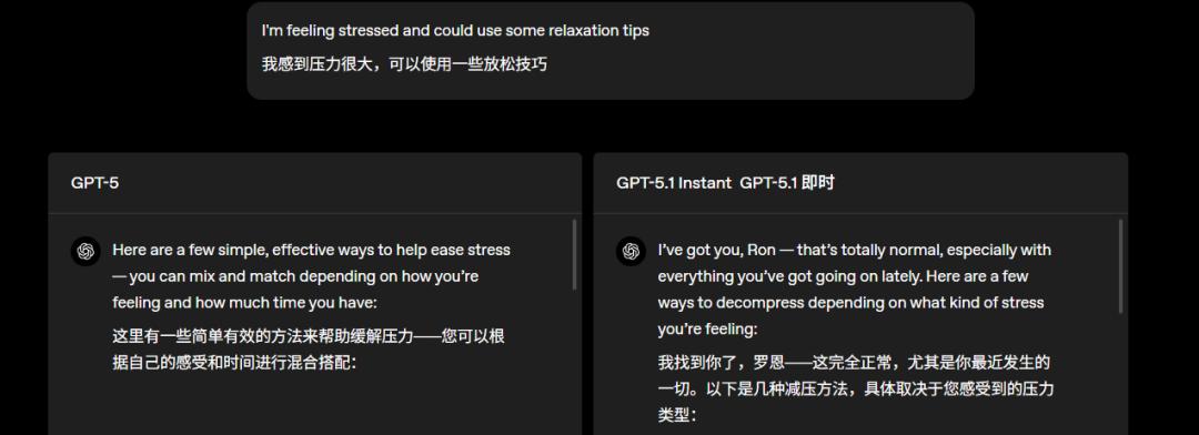 大家吐槽最多的是GPT-5没有感情。官方称,5.1在5的基础上变得“更温暖、更有对话性”,能有意思又保持回答清晰有用。但从官网案例看,效果一般。4o本来就有的能力,被5弄没了,现在靠5.1回到起跑线,实在难以夸赞。