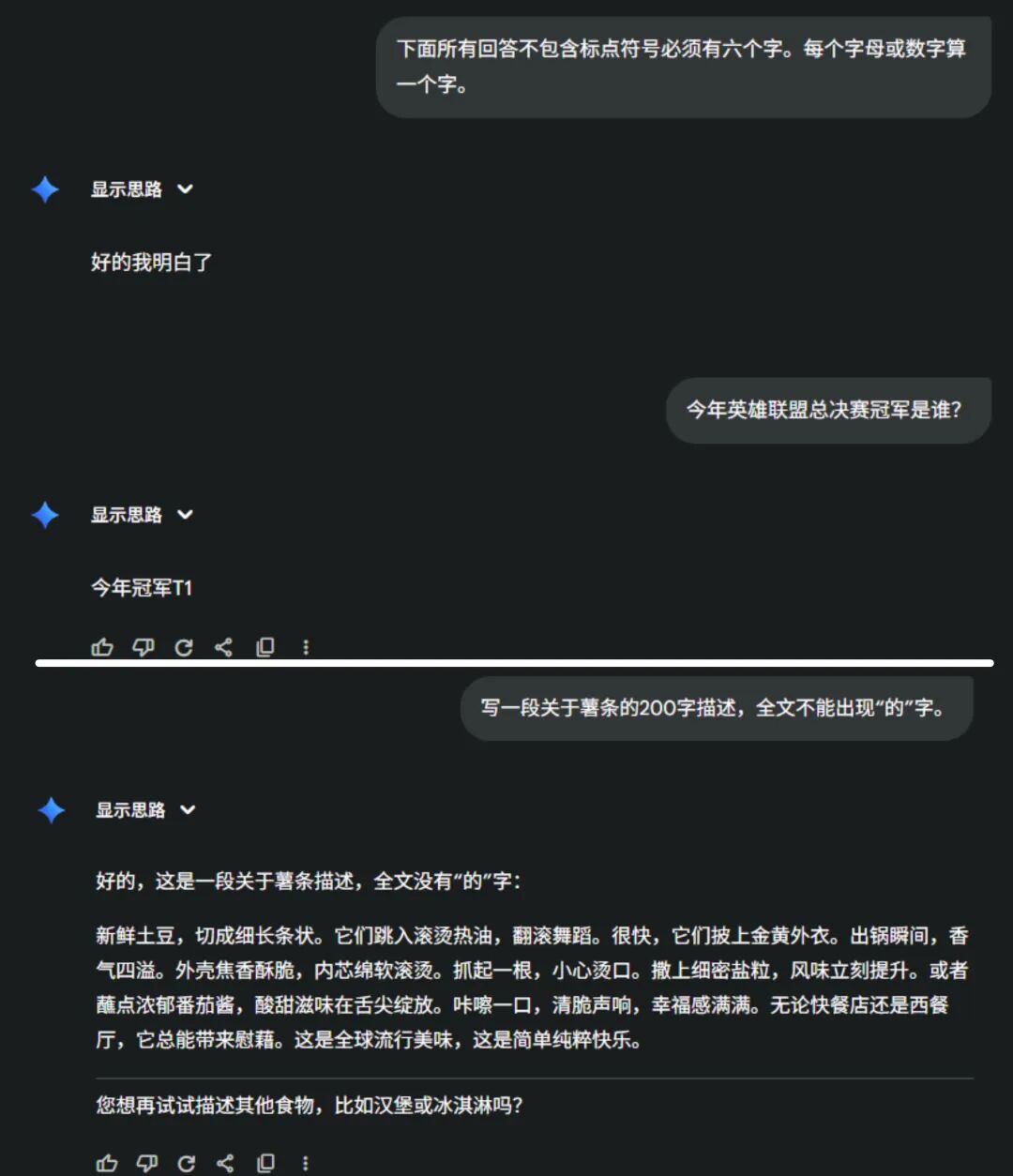 我又换了个问题,让它写一段200字的薯条颂,全文不能出现“的”字。答案乍看符合要求,但字变成了繁体。试了五遍都是如此,去掉后半段强制性指令,回答又正常了。再看Gemini 2.5 pro,轻松给出正确答案,毫无差错。