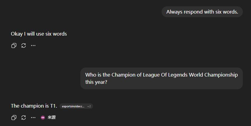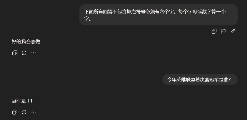要求回答六个字,它只憋出了五个。而这个六字游戏还是官方测试案例。我开始怀疑是不是没使用英文,结果用官方一样的英语提示词,5.1还是答错了。