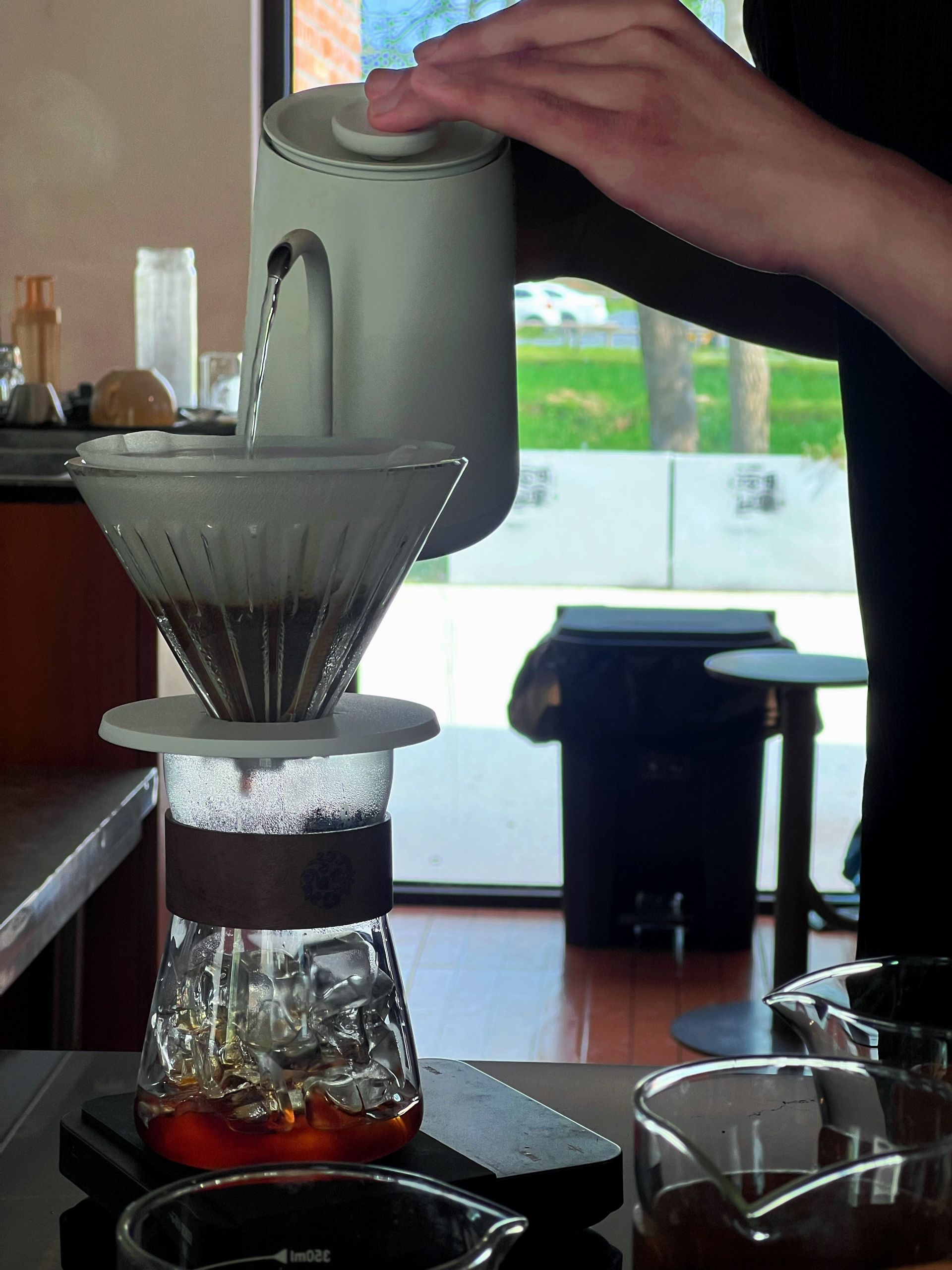 野豆集的红砖房静静地立在稻田尽头。推开门,咖啡香扑鼻而来。主理人周华健正在吧台后专心调试磨豆机,银色机器发出均匀的研磨声。“这是一款厌氧日晒的咖啡豆,用威士忌雪莉酒桶发酵,自带淡淡的酒香。”他一边介绍,一边将88摄氏度的热水注入滤杯、浸润咖啡粉,热气中,混合着酒香、木质香的咖啡香味弥漫开来,很快,一杯手冲咖啡递到我面前。