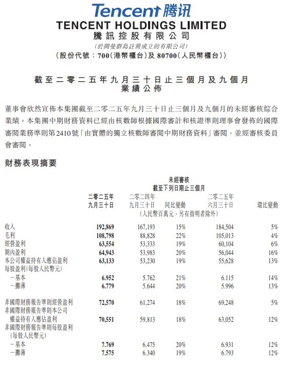 11月13日,腾讯控股发布三季度财报。该季度公司实现营收1928.7亿元,同比增长15%;经营利润(Non - IFRS)725.7亿元,同比增长18%。