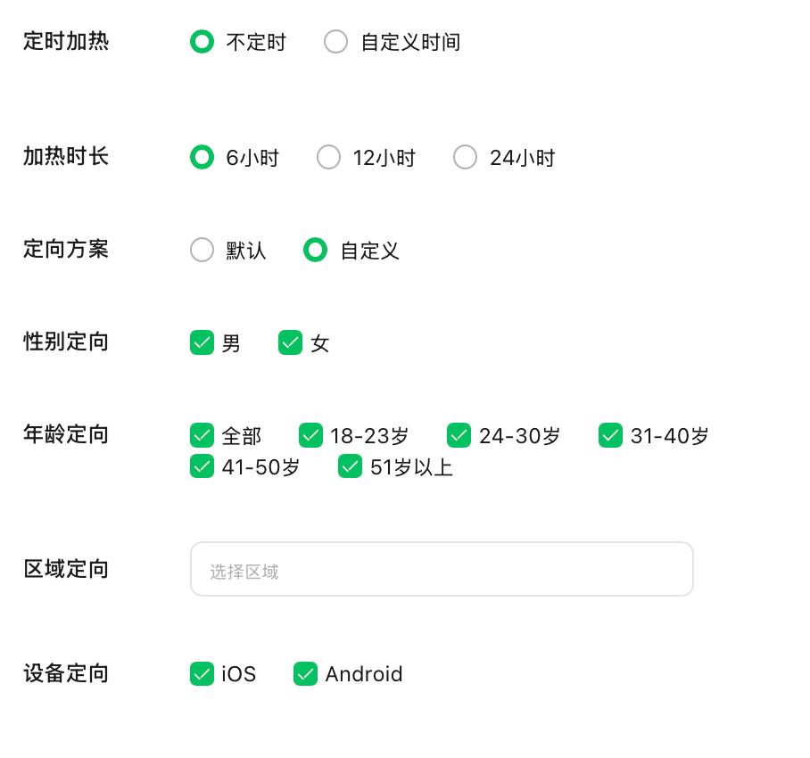 付费加热方案可自定义,能选择时长、性别、年龄、区域、设备等定向维度。选默认则上述条件均勾选。
