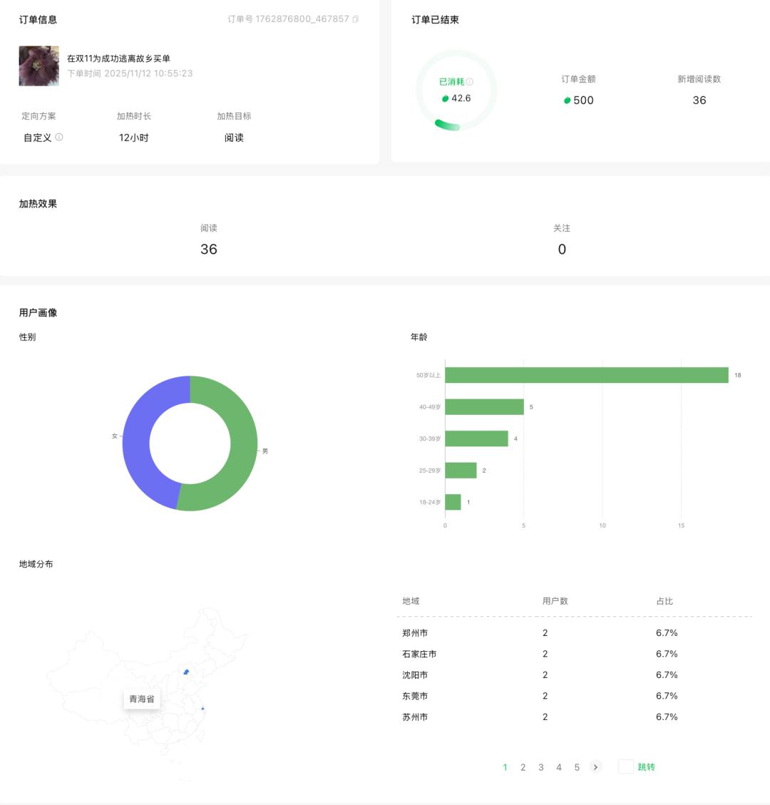 11月12日上午,对该公众号近期发布的一篇情感类原创内容付费加热。数据显示,加热12个小时后,文章新增36个阅读,消耗42.6微信豆。