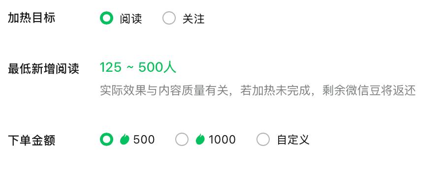 微信官方在加热页面标注“实际效果与内容质量相关”,可见500微信豆换来的最低新增阅读数有浮动。