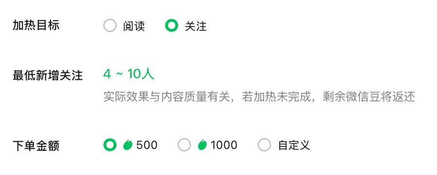 选“阅读”为目标,500微信豆可带来最低新增阅读125 - 500人;选“关注”为目标,相同充值数额可带来最低新增关注4 - 10人。显然,增加粉丝关注比提升文章阅读量更难。