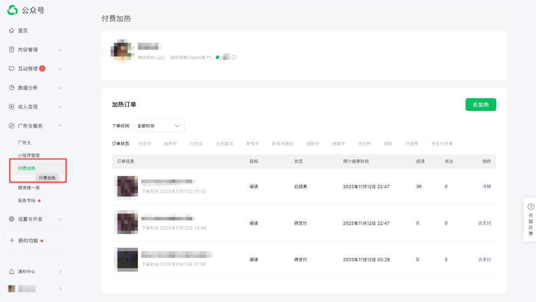 “付费加热”页面会显示公众号的加热订单状态、微信豆账号余额等信息。
