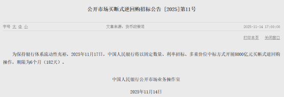 11月14日,中国人民银行(下称“央行”)发布预告,将于17日以固定数量、利率招标、多重价位中标方式开展8000亿元买断式逆回购操作,期限为6个月(182天)。从11月操作量与到期量综合来看,本次操作意味着当月央行买断式逆回购会加量续作,累计净投放5000亿元。