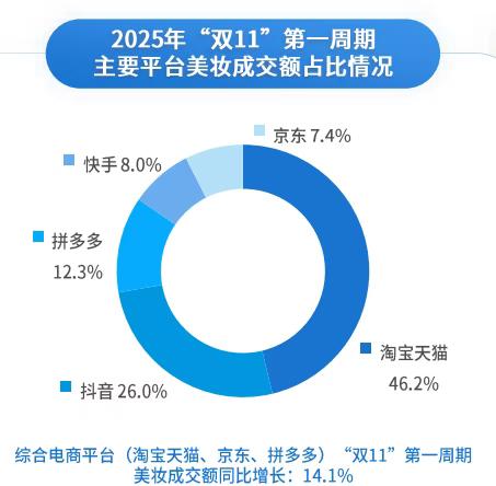 据易观双11观察报告,今年双11第一周期,淘天美妆成交额占比46.2%,抖音占26%,拼多多占23.3%,快手和京东平分剩余份额。