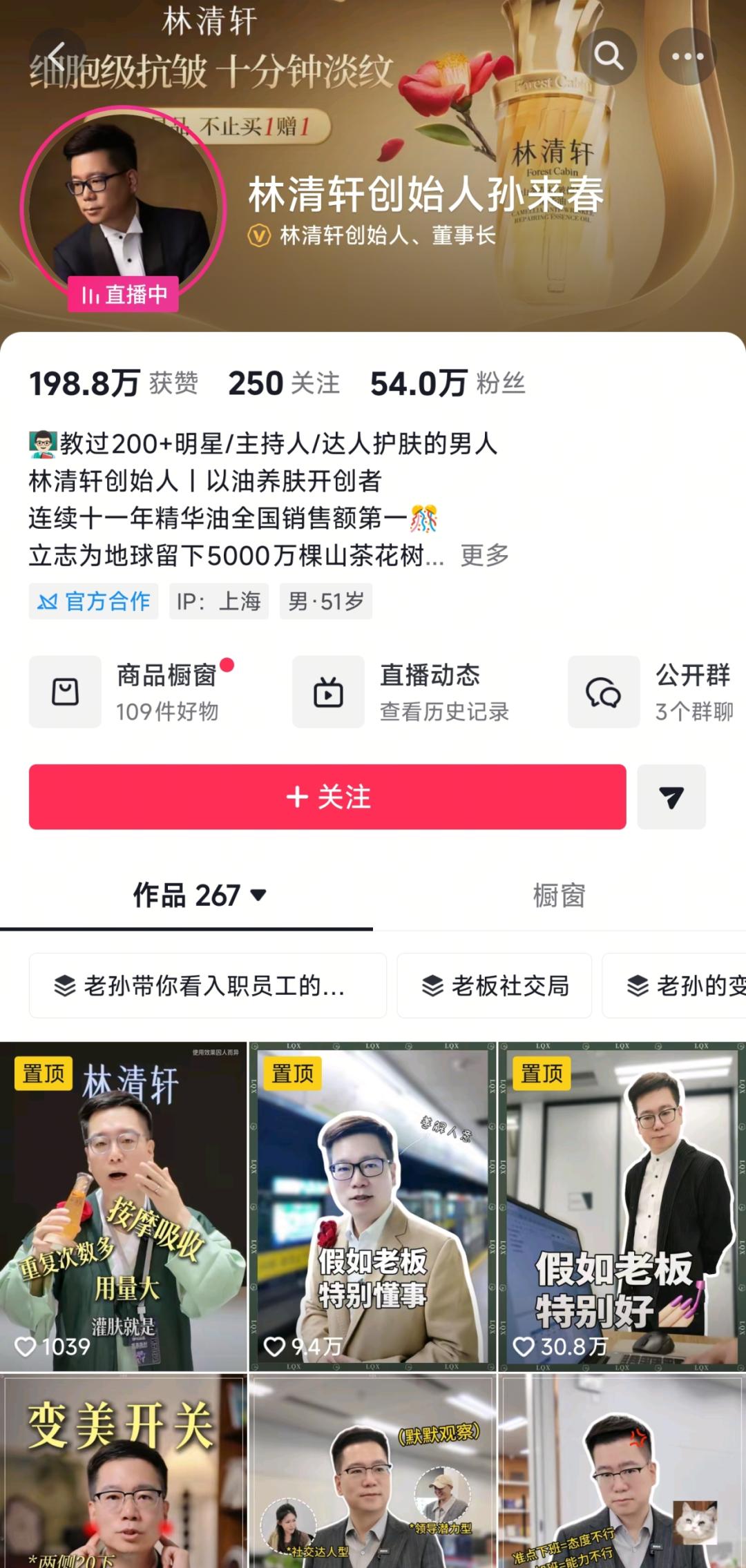 林清轩以创始人IP破圈。创始人孙来春入驻抖音,高频直播带货,双11贡献1000万至2500万元销售额,还发布短视频引流。视频分干货和剧情两类,提升用户对品牌的信任感和亲近感。