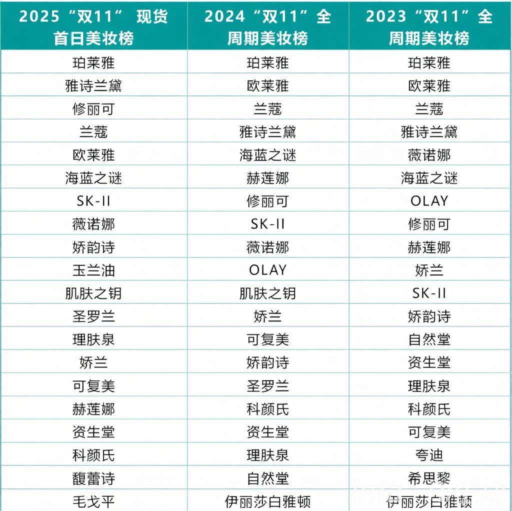 不过,天猫美妆整体格局仍由国际大牌主导。2023 - 2025年,珀莱雅、欧莱雅、兰蔻和雅诗兰黛连续三年稳居天猫美妆榜TOP5,头部品牌固化特征明显。