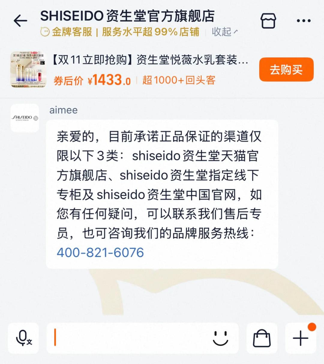 大学生胡越在大主播直播间看到国际品牌资生堂套装后,因担心真假,咨询淘宝客服得知正品渠道仅为天猫旗舰店、线下专柜和官网,最终选择在天猫官旗店购买。