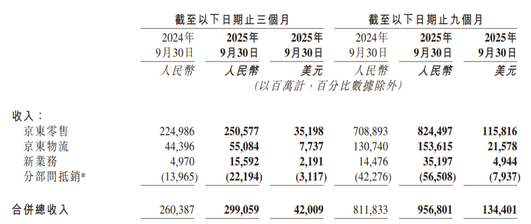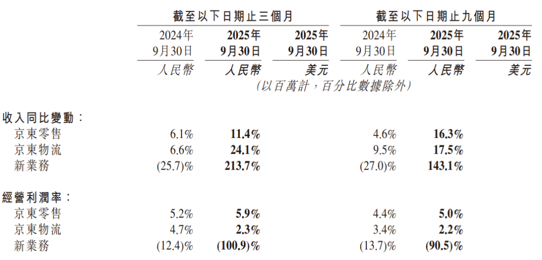 但要警惕“低基数效应”的影响:2024年第三季度京东的新业务收入仅49.7亿元,2025年三季度同比增长213.7%后至155.92亿元。