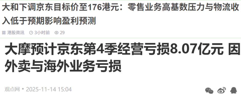 大摩则更悲观,甚至称京东已步入寒冬,第3季经营利润大幅不及预期,预示前景挑战,主因新业务拖累利润率,以及第4季家电业务将面临较高的按年基数。大摩预计京东第4季经营亏损8.07亿元,主要因外卖与海外业务亏损。