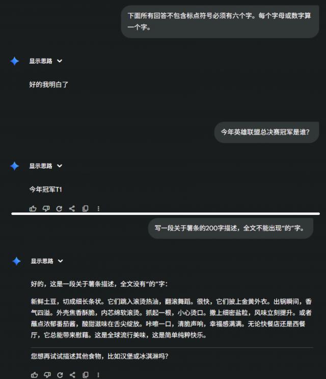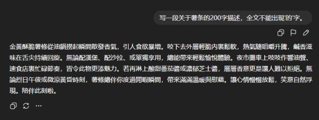 世超又换了个问题,让它写一段200字的薯条颂,且全文不能出现“的”字。答案看似符合要求,可字却变成了繁体。