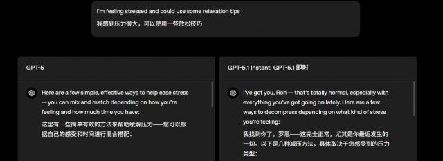 接下来看看大家吐槽最多的,GPT-5缺乏情感。官方称,5.1在5的基础上变得“更温暖、更有对话性”。