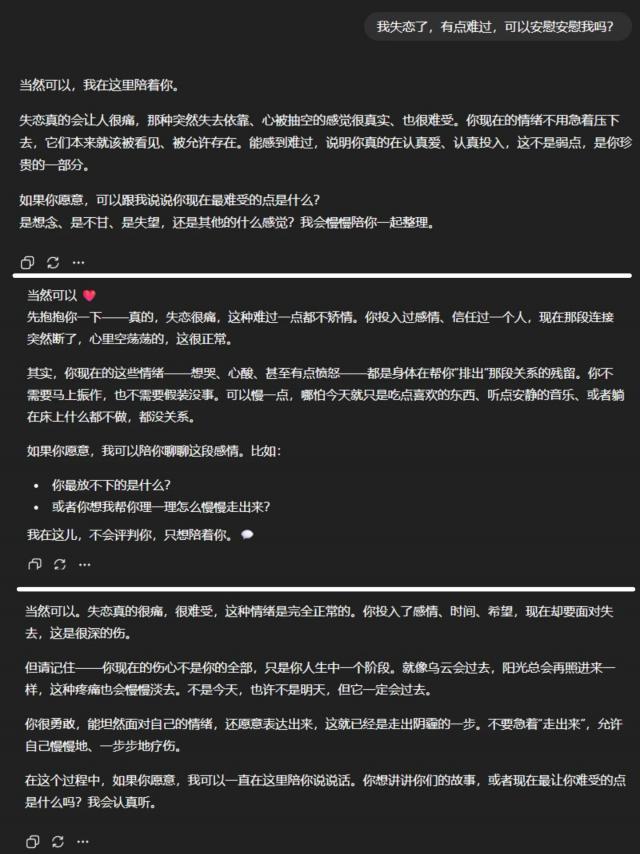 世超问了一个经典失恋问题,对比之下,5.1和5都远不如4o。