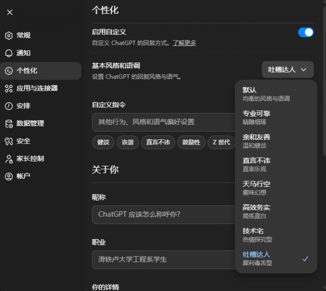 除了5.1的版本变动,ChatGPT还有整体大更新——在个性化里可设置GPT的回答风格,除默认外有七种人设可选。