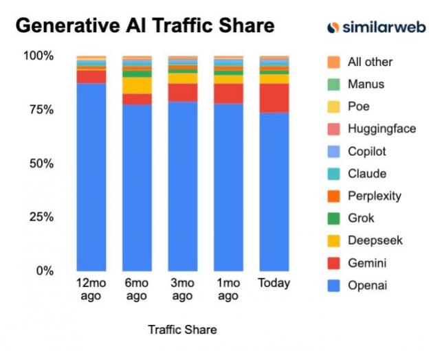 根据报告,GPT在2025年市场份额持续萎缩。AI界竞争残酷,竞品市占率增长迅速。