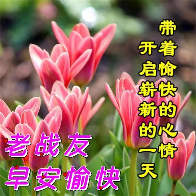 各位老战友,早上好!空间拉近了我们的距离,短信让我们每日相逢,友情让我们彼此牵挂。清晨,我送上最真诚的祝福,愿大家平安、健康、幸福、快乐!早安吉祥,早餐愉快!