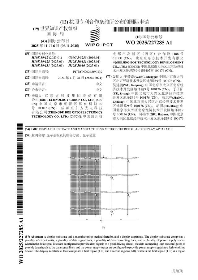 京东方A公布“显示基板及其制备方法、显示装置”国际专利申请
