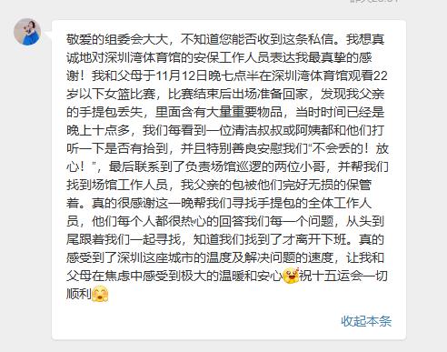 文明办赛,正是服务者的深夜暖光。11月12日晚,有一名观众在女篮赛后遗失装有重要物品的手提包,深圳湾体育馆的安保、清洁阿姨、场馆负责人立刻启动“全员联动”——安保调阅3小时监控锁定区域,清洁阿姨带着失主逐一排查看台,深夜值守的负责人联系到施工区巡查员,最终找回完好的包。工作人员全程陪同失主确认物品,直到深夜11点多才下班,失主在感谢信里写:“深圳的温度,是深夜为陌生人亮着的那盏灯。”