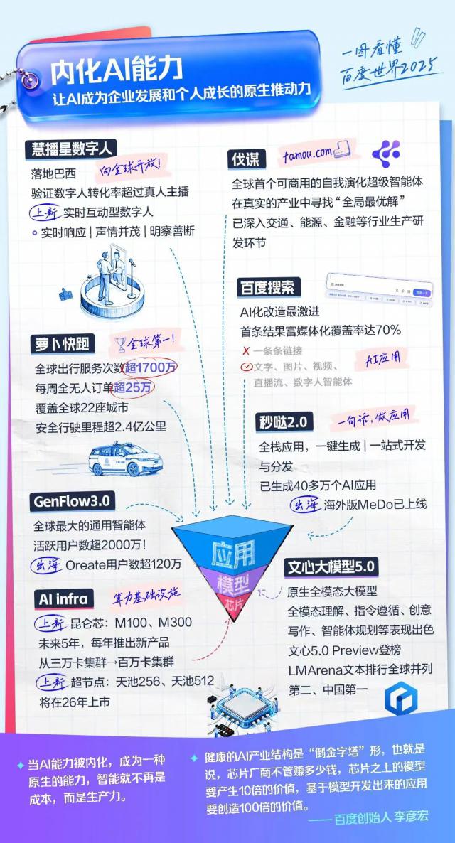 在近期的百度世界大会上,百度创始人李彦宏率先指出:只有当AI被内化为一种原生的能力,才能真正在各行各业实现效果的涌现,进而引发一场全面的生产力革命,推动经济增长,让“智能红利”转化为“社会红利”。