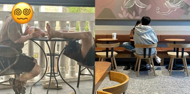 首先是“坐姿不雅派”,他们在店内休息时姿势奇特。有人把脚放在店外桌子上,还有人在座位上脱鞋、盘腿,把咖啡店弄成了农村大炕的感觉。