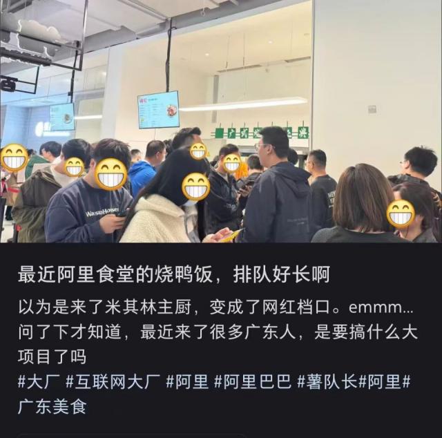招来的人员中疑似广东人最多,爆料显示阿里食堂的粤菜窗口排起了长龙,烧鸭饭都快卖脱销了。