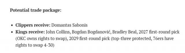 国王队得到:约翰 - 科林斯、博格丹 - 博格达诺维奇、比尔、2027年首轮签(雷霆队拥有互换权)、2029年首轮签(前三顺位保护,76人队拥有4 - 30顺位互换权)
