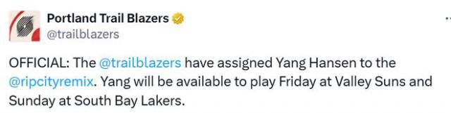 开拓者官宣下放杨瀚森,本周六迎发展联盟首秀并连续出战太阳湖人