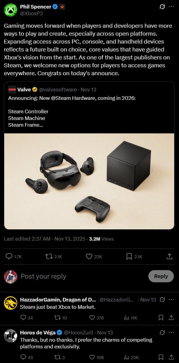 Xbox的重要人物已在社交平台发声,称赞SteamOS全家桶实现了Xbox的核心价值观: