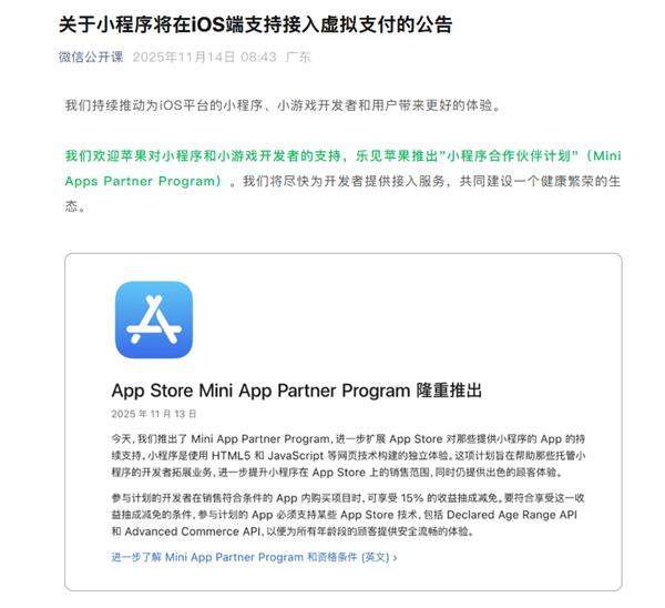 微信表示:“我们欢迎苹果对小程序和小游戏开发者的支持,乐见苹果推出‘小程序合作伙伴计划’(Mini Apps Partner Program)。我们将尽快为开发者提供接入服务,共同建设一个健康繁荣的生态。”
