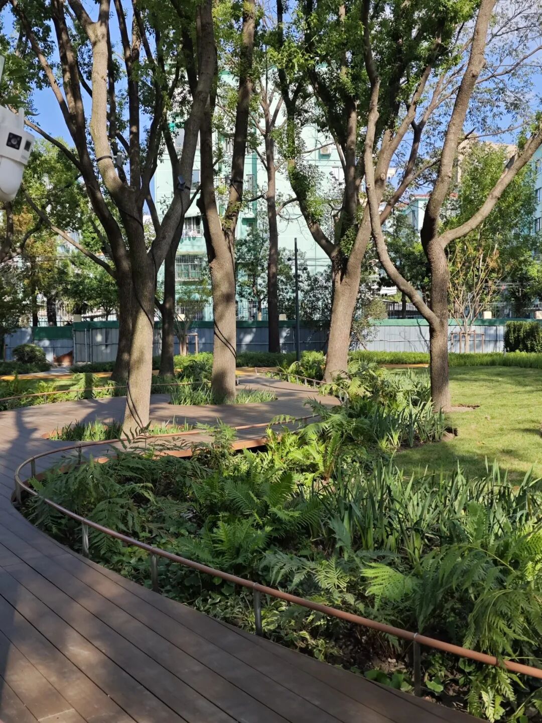 改造后的广场绿意更浓。在生态景观方面,除保留现场植物外,对大乔木进行修剪,调整场地郁闭度,在活动密集区打造阳光草坪,林下增设木栈道和雨水花园。阳光草坪选用耐践踏的中华结缕草,中层增添紫薇、垂丝海棠、蜡梅等开花小乔木,地被种植多种耐湿、净化能力强的植物,还增加了绝代佳人月季、鼠尾草等开花植物,优化了植物层次,提升了空间观赏性和生态舒适度。