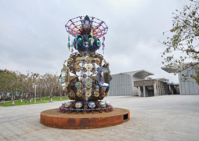美术馆户外广场的大型雕塑——陈世英作品《诞生》,将限时展出至11月16日,为2026年夏将在意大利威尼斯与中国上海启幕的“陈世英:他界之器”双城展预热。这件作品是艺术家“他界之器”系列巨型钛金属雕塑的首件作品,高7米,重4.6吨,灵感源自盛载圣油的油壶,象征人性之初。《诞生》由5500件钛金属、1500件铝合金组件及近20000颗不锈钢螺丝构成。725个齿轮与922个人像,在咬合与凝视中,表达命运互联、众生共鸣。当光穿透金属,仿佛能感受到机械与人性一同呼吸。