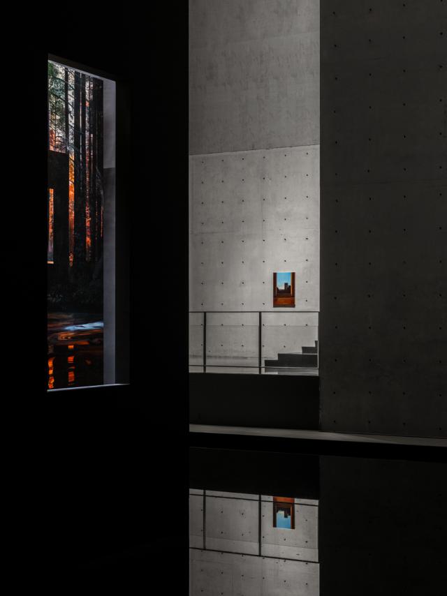 展览空间从一道窄门开始,这道窄门如同黑鹰与白鹰,在不同房间里闪现、盘旋。在画作中,窄门有时是一道细长的亮光,有时是一个宽大的门廊,有时又藏在盒子里等待被发现。展览还特别配合作品布置了一汪水潭,让空间成为生命境遇的旅程,以写意的方式传递情感。