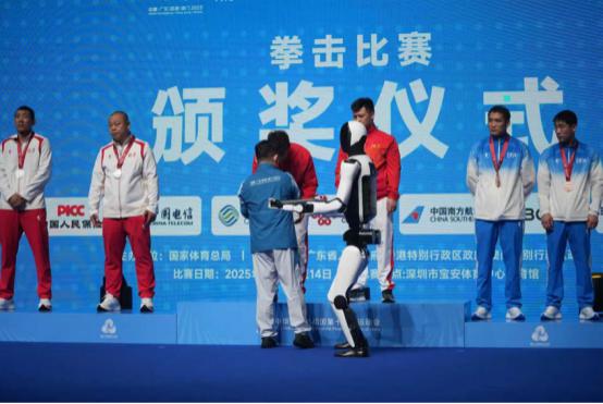 11月14日,十五运会拳击比赛收官日,男子92公斤级颁奖仪式上,出现了令人眼前一亮的颁奖助手——人形机器人。