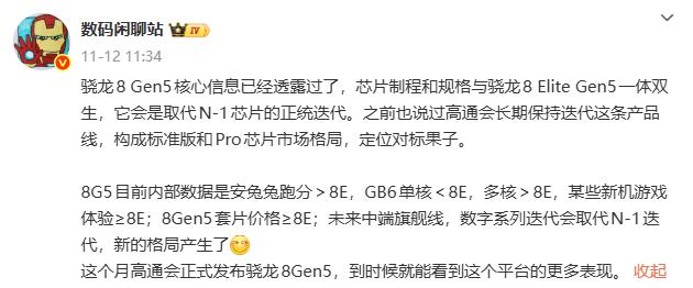 这颗芯片之前果子也和大家聊过,在高通内部定位是取代骁龙8至尊的。虽然在我们看来更像是现在“8s”的定位,但从目前曝出的信息来看,它的性能并不弱于8至尊版,还是值得期待的。如果后续能有更低的价格,那就更完美了。