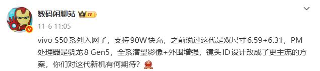 影像方面,S50系列全系将配备IMX882,也就是LYT - 600级别的潜望长焦。考虑到上次X300发布会上vivo和索尼定制了一颗LYT - 602传感器,不出意外的话,S50系列用的就是这颗。主摄和超广角目前未知,果子猜测应该和上代差距不大。