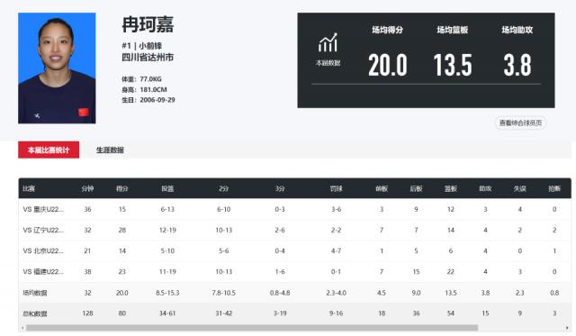 目前,冉珂嘉这四场比赛场均出战32分钟,能拿到20分、13.5个篮板(其中4.5个前场篮板)、3.8次助攻、0.8次抢断和0.5次盖帽,命中率为55.7%,三分命中率15.7%,罚球命中率56.25%,她的三分和罚球都有待提高。