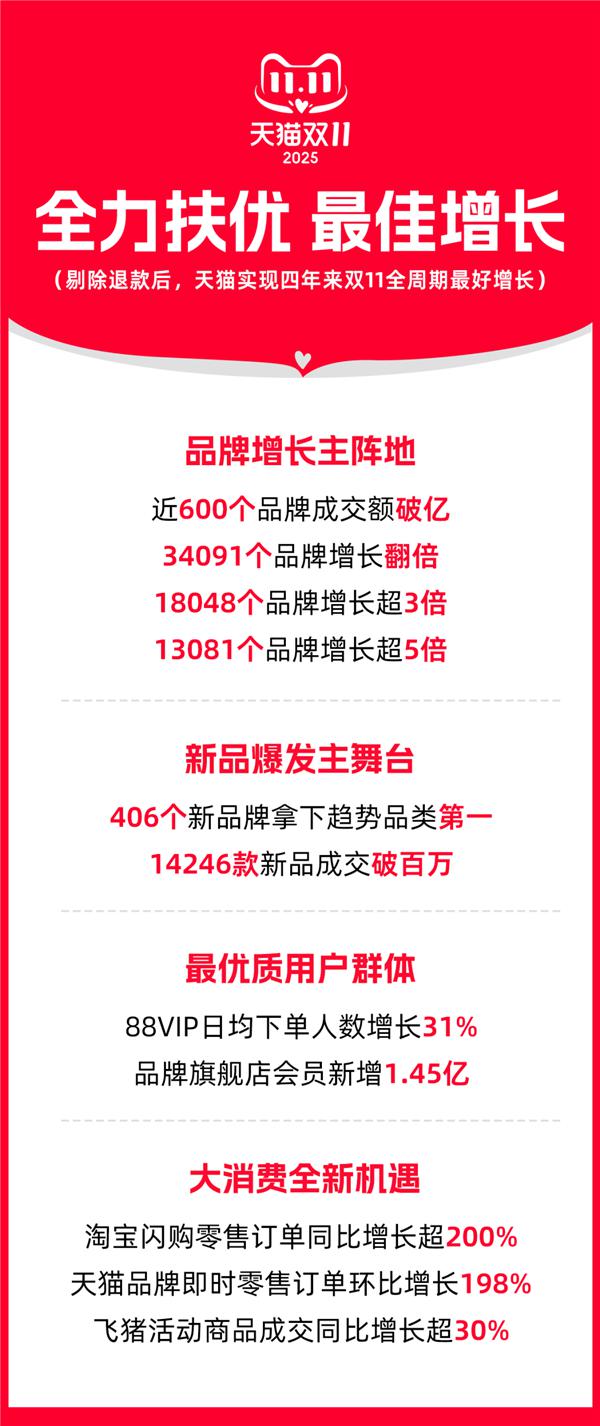 快科技11月15日消息,天猫官方发文称,2025年天猫双11实现了四年来最好的增长。