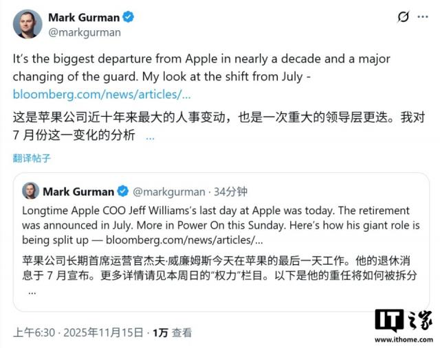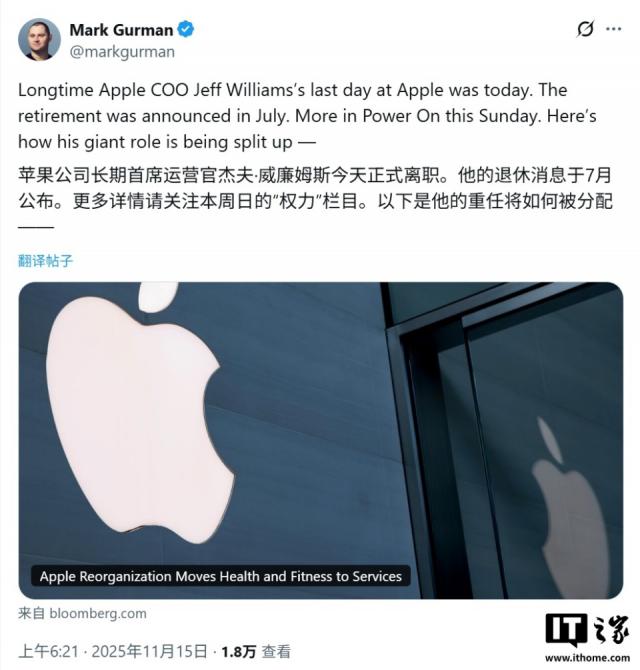 IT之家11月15日消息,彭博社的马克・古尔曼(Mark Gurman)今天(11月15日)在X平台发布推文,报道称苹果公司前首席运营官杰夫・威廉姆斯(Jeff Williams)今天已正式退休离职。