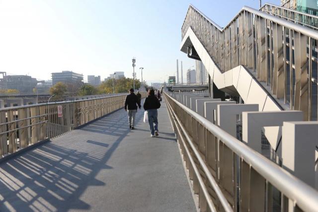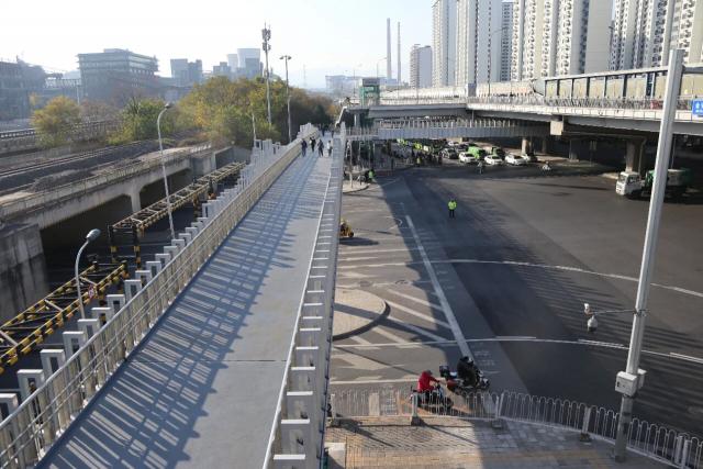 建设时,项目团队克服困难,通过夜间施工、优化吊装路径、迁移地下管线等,在保障桥区正常秩序下如期完工。天桥开通后,行人穿越时间从6分钟减到2分钟以内,换乘效率提高40%;人车分流,机动车速度提高3倍多,路口交通事故率为零。