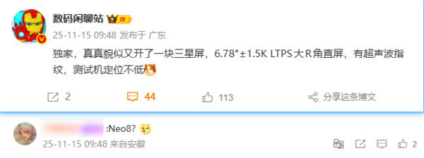 CNMO还了解到,此前该博主爆料称真我Neo8是“极致性能定义的大电池直屏机”。参考上代Neo7于2024年12月发布,Neo8有望在2025年底或2026年初正式亮相。