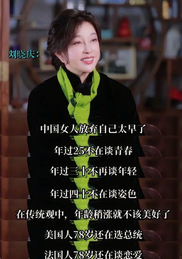刘晓庆曾说:“中国女人,放弃自己太早了。年过二十五不再谈青春,年过三十不再谈年轻,年过四十不再谈姿色,年过五十,就被所有人认为到了该带孙子的年纪了。年过六十谈恋爱,别人都会觉得你黄昏恋,夕阳红,不害臊之类的。”但实际上,无论什么年龄,都有绽放自己美的权利,都有追求自由的权利。从这方面看,晓庆老师的观念很超前。