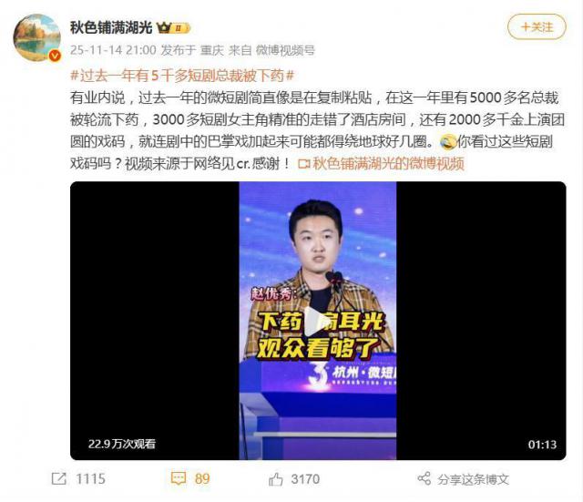 据网友11月14日爆料,一则业内调侃让微短剧的“套路化生产”登上热搜。在杭州某微短剧大会上,一位制片人开玩笑称:“过去一年有5000多名总裁被轮流下药,3000多女主精准走错酒店房间,2000多千金上演团圆戏码,剧中的巴掌戏加起来可绕地球好几圈!”这些戏谑的数字并非真实统计,但却精准地指出了短剧行业“复制粘贴”式创作的问题。
