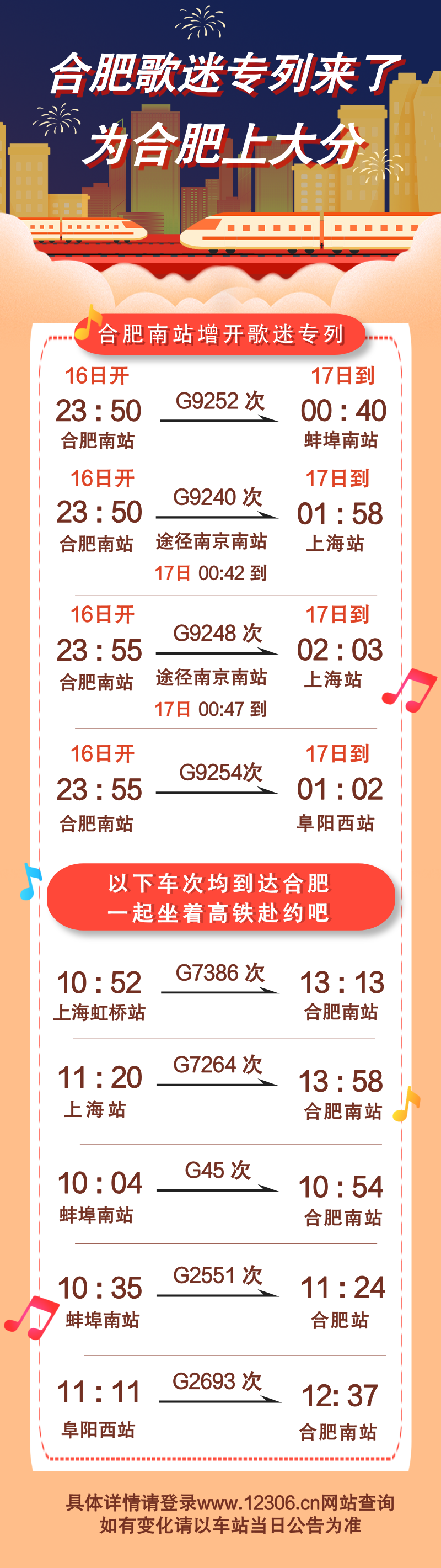 周深合肥演唱会增开4列专列:11月16日,增开合肥南站至蚌埠南站G9252次、合肥南站至阜阳西站G9254次、合肥南站至上海站G9240次和G9248次。