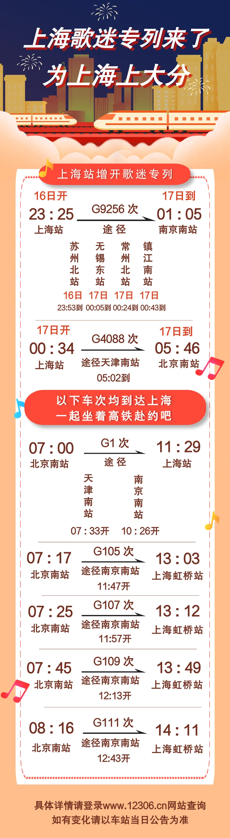 五月天上海演唱会增开2列专列:11月16日,增开上海站至南京南站G9256次;11月17日,增开上海站至北京南站G4088次。